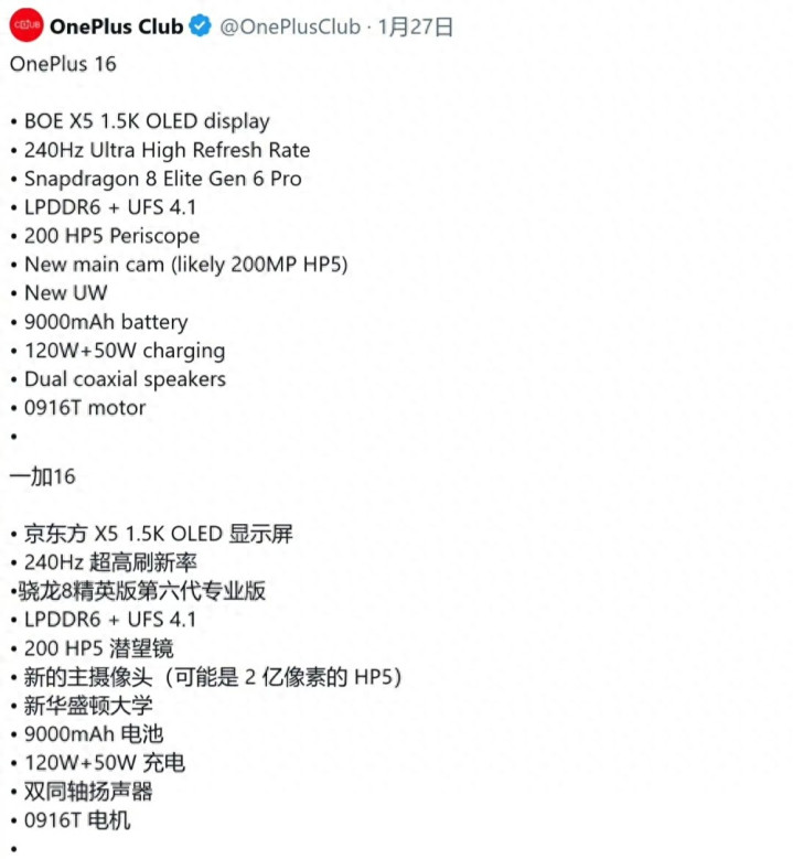 继上月OnePlus Club晒出了一加16包括屏幕、责罚器、续航、影像等成就参数之后,日前,其再次在X平台上露馅了一加16的潜望长焦镜头的具体参数,该镜头的像素和感光面积再次赢得了进步。而凭证其此前晒出的信息夸耀,该机将搭载的是高通第六代骁龙8至尊版责罚器、双2亿像素主长焦、9000mAh电板和240Hz超高刷屏等。