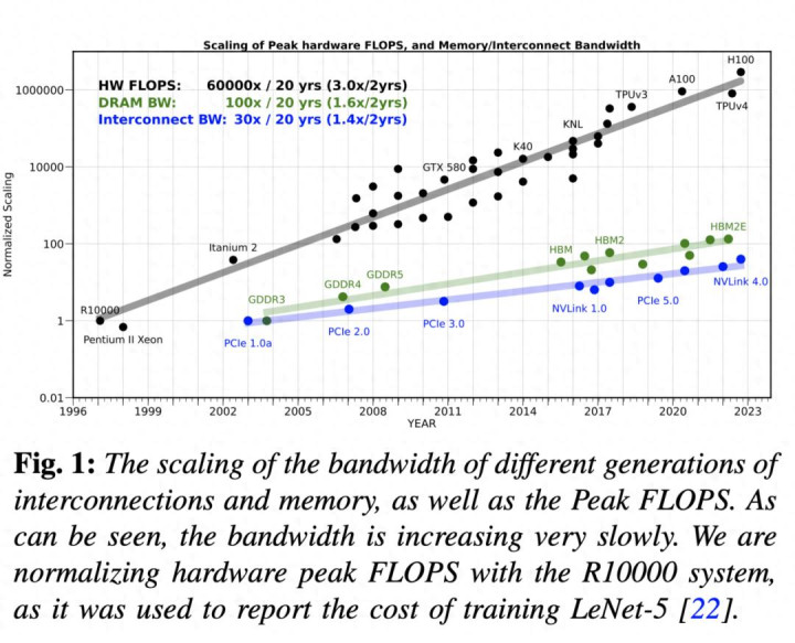 咱们开端分析自 1998 年 Yann Lecun 在 MNIST 数据集上教师出驰名的 Lenet-5 模子以来,做事器级 AI 硬件的峰值缱绻才略发生了奈何的变化。咱们不错看到,畴前 20 年间,硬件的峰值缱绻才略增长了 6 万倍,而 DRAM 的峰值缱绻才略仅增长了 100 倍,互连带宽也仅增长了 30 倍。