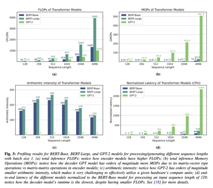 为了诠释研讨算术强度的伏击性,咱们研究了 BERT-Base 和 BERT-Large 以及 GPT-2 。前两者是编码器模子,其推理触及矩阵-矩阵运算;后者是解码器/自转头模子,其推理触及同样的矩阵-向量乘法。 B. 性能分析 为了分析 Transformer 职责负载在通用硬件上的瓶颈,咱们在 Intel Gold 6242 CPU 上对 Transformer 推理进行了性能分析。图 3 自满了不同序列长度下这些模子的总 FLOPs、MOPs、算术强度和最终延伸。昭彰,对于每种序列长度,GPT-2 的延伸齐昭彰长于 BERT-Base 或 BERT-Large,即使 BERT-Base 和 GPT-2 的模子确立和端到端 FLOPs 基本相易(如图 3a 所示)。这是由于 GPT 的自转头推理固有的矩阵向量运算具有更高的内存操作量和更低的算术强度(见图 3c)。算术强度更高的模子在相易以致更高的 FLOPs 下不错比算术强度更低的模子驱动得更快。这了了地标明,内存墙若何成为解码器模子(在小批量大小下)的主要瓶颈,而不是缱绻瓶颈。