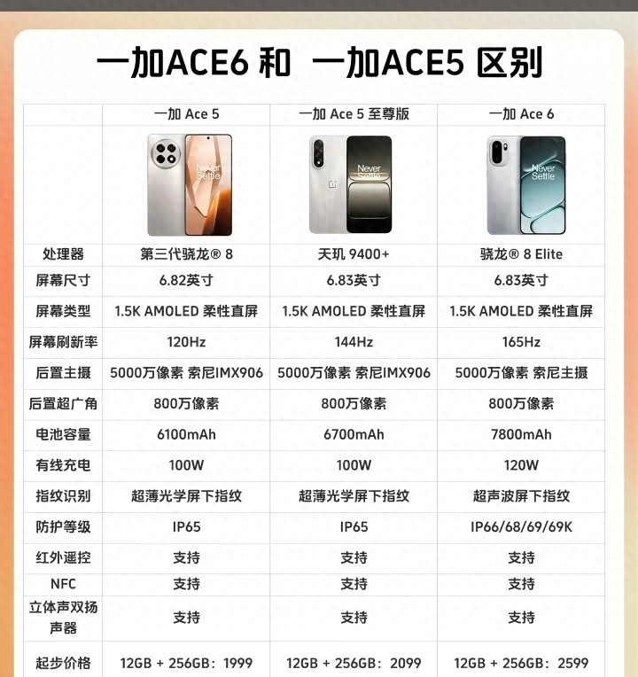 5:详尽来看,一加Ace 6相干于一加Ace 5系列的升级是全标的且极具忠诚的。它在保捏了Ace系列一贯的高性能基因的基础上,通过搭载最新的骁龙8 Elite处理器、165Hz超高刷屏幕、7800mAh超大电板以及IP69级防尘防水等进步成立,将产物力晋升到了一个新的台阶。固然起步价钱相较于前代有所高涨,但研究到其在中枢成立与用户体验上的显贵晋升,这一价钱调节无疑是合理的。