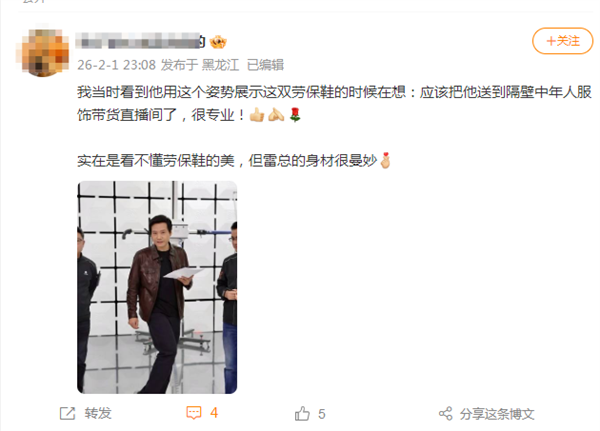 有网友玩笑称:我那时看到他用这个姿势展示这双劳保鞋的时辰在思:应该把他送到近邻中年东谈主衣饰带货直播间了,很专科!着实是看不懂劳保鞋的好意思,但雷总的肉体很唯妙。