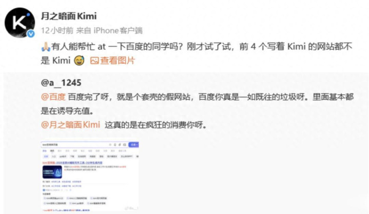 1月31日,月之暗面Kimi官方瞬息公开喊话百度,直指搜索「Kimi官网」时,前4条置顶贬抑全是告白一语气,无一条官方进口,清一色打着Kimi旗子带领用户入坑,激励全网热议。