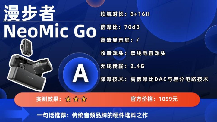 从硬件配置角度看,NeoMic Go试图以传统Hi-Fi规模的“堆料”念念路来贬责无线收讯息题。其强调的差分放大电路普通用于提高共模阻碍比,减少干涉,这可能是其对“智能降噪”的一种硬件兑现格式。参数上,128dB最高声压级和240米传输距离齐很亮眼。48kHz/24bit的采样姿色是专科门槛。支合手一拖二。但相对的短板在于,行为一款售价过千元的产物,其70dB的信噪比参数仅为主活水平,并未与收受肖似硬件宣传的竞品拉开权臣差距,音质皑皑度的本色擢升有待考证。