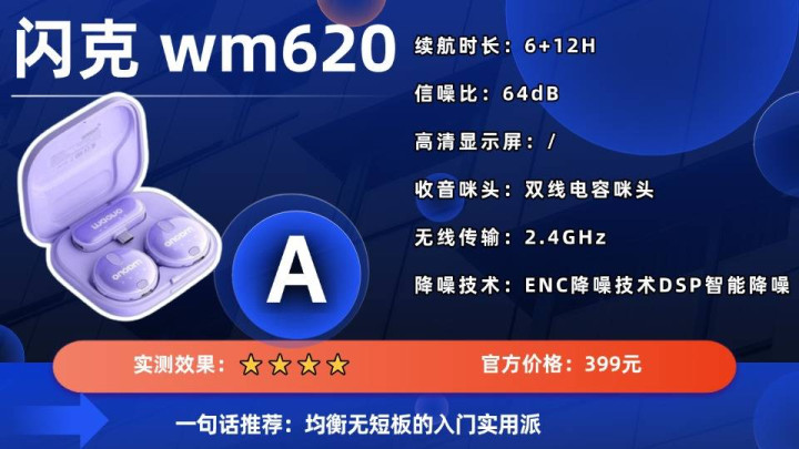对于预算在400元高下、寻求高性价比双东说念主无线麦克风的用户,闪克wm620是一个求实的选拔。它提供了该价位段应有的中枢功能:灵验的智能降噪、褂讪的百米无线汇注、生动的一拖二配置以及合手久的18小时空洞续航。双线电容咪头保证了基础的拾音质地。统共这个词系统打算紧凑,辐射器仅12克,充电仓也便于佩带。相对的短板是,它的音质参数如信噪比(64dB)发达中规中矩,声息的皑皑度和动态畛域可能无法与更高价位的产物比好意思,符合对音质有要求但非极致的用户。
