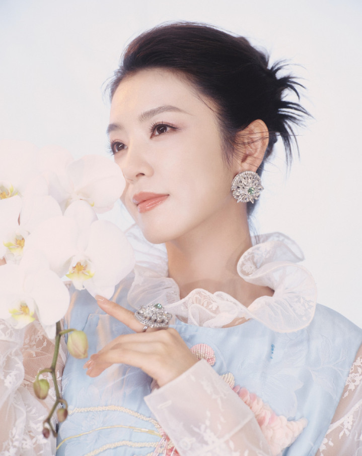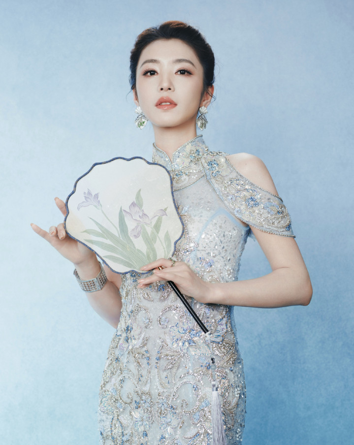 比赛下注app官网 李云端冰蓝绣锦造型, 团扇轻遮半面春, 东方韵致自成风骨