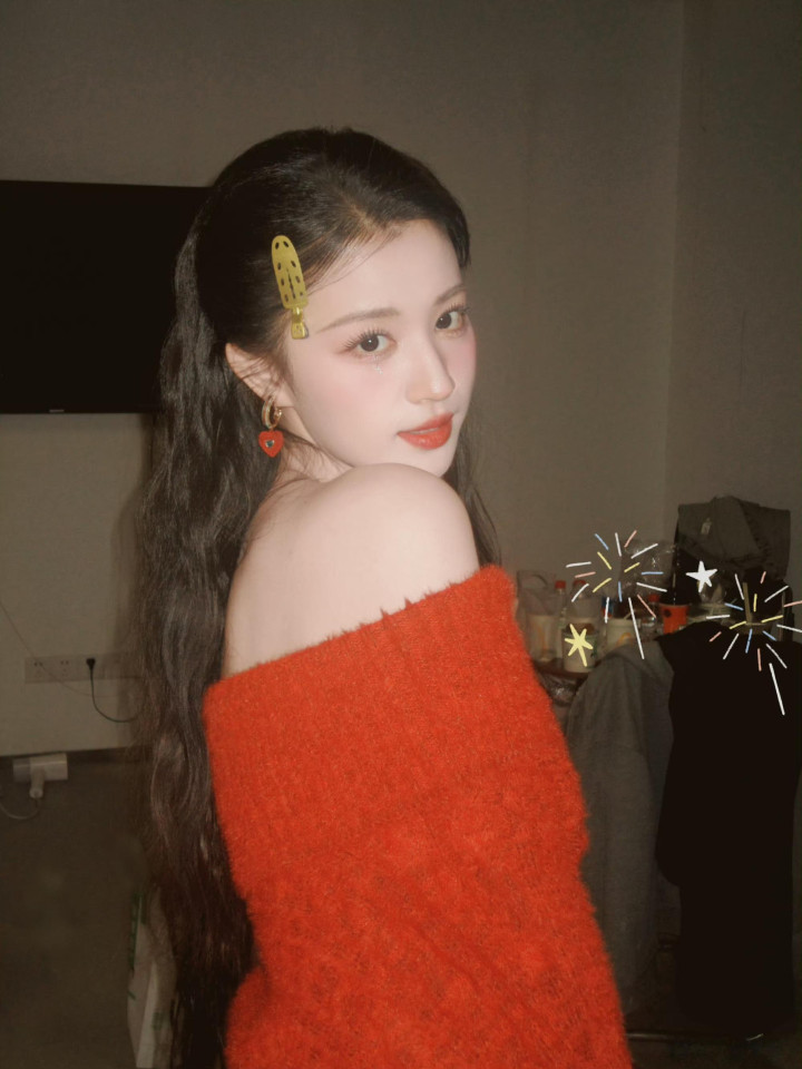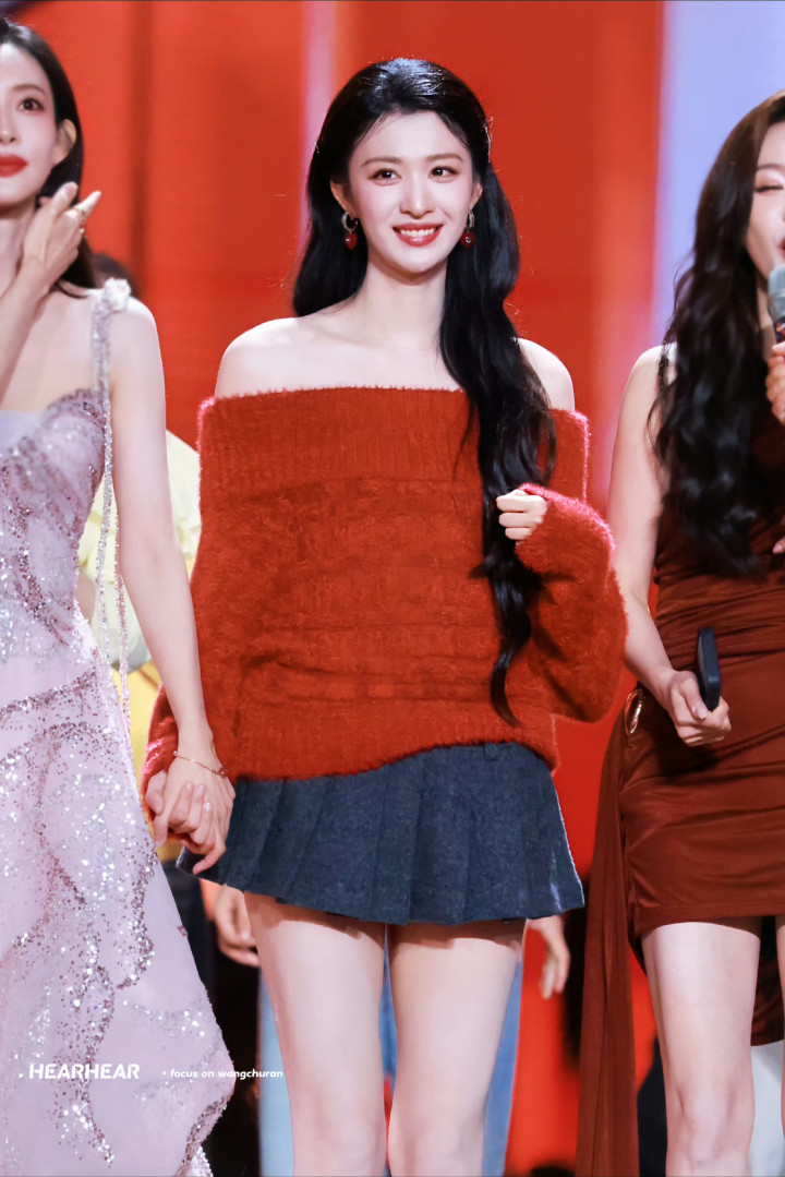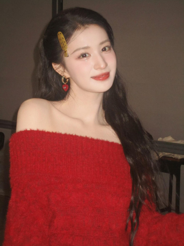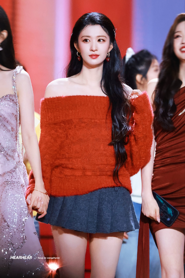 晚会上的第二套造型,更是将清甜与性感糅合得恰到刚正。红色一字肩毛绒上衣领口微垂,披露的锁骨追究又诱东谈主。灰色百褶裙随次序轻晃,划出灵动俏皮的弧度,尽显唯妙身姿。