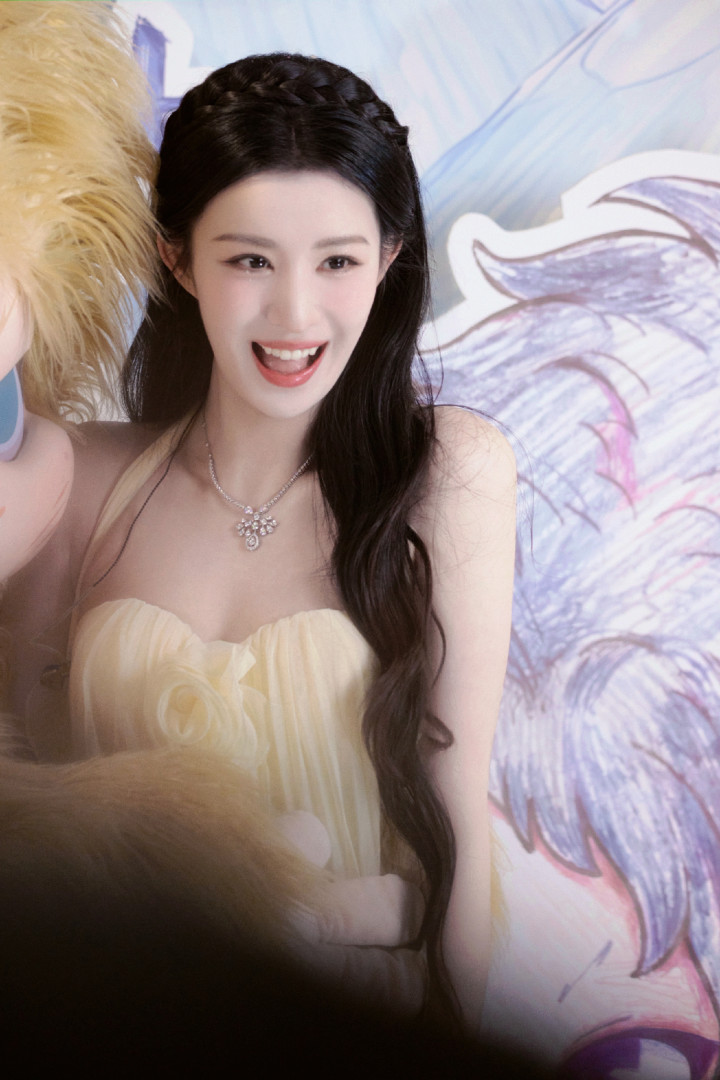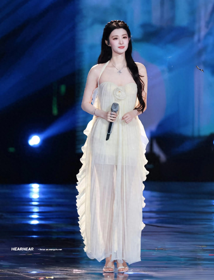 一袭米白挂脖礼裙勾画出玲珑有致的身体,裙摆垂坠的褶皱如同烟霞缥缈,肩颈线条愈发修长迷东谈主。