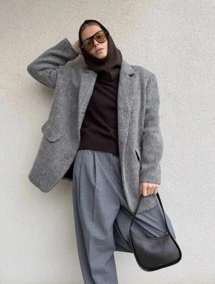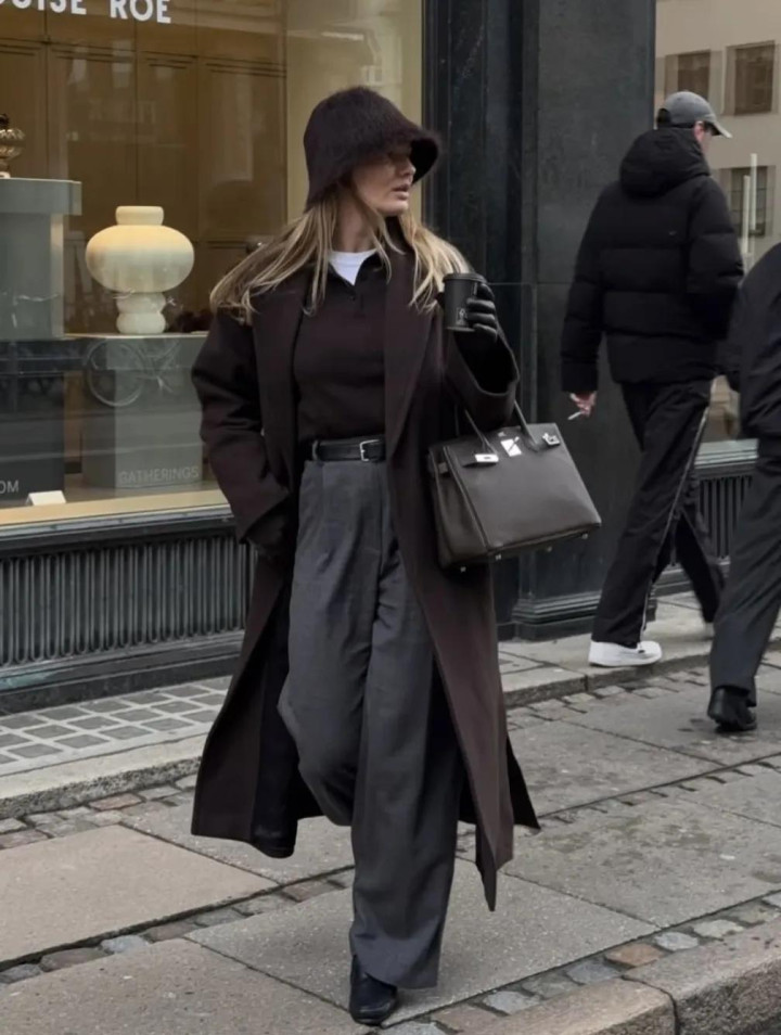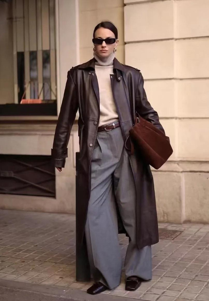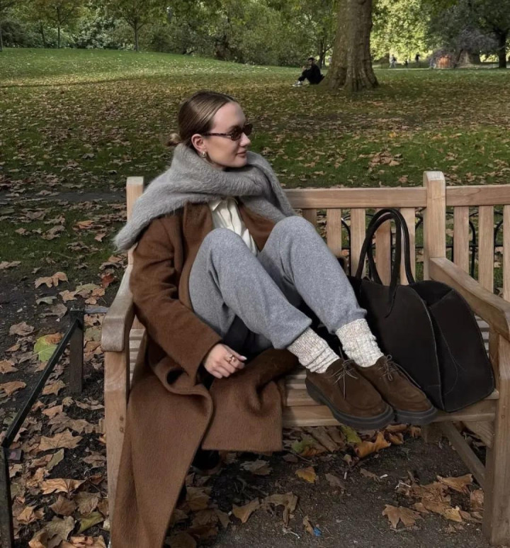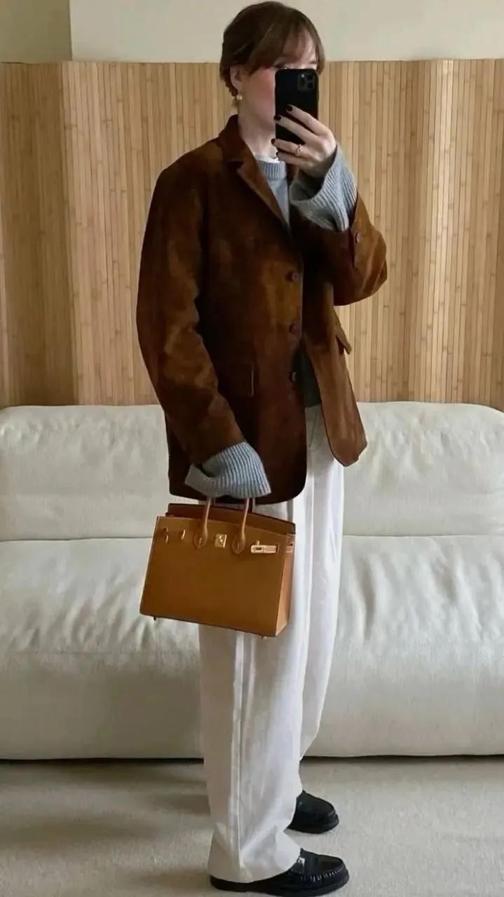 麂皮外衣本年又翻红了,尤其是棕调的。内搭灰色高领毛衣,下穿西裤,袜子与帽子呼应,连指尖的包袋齐不曾自便。
