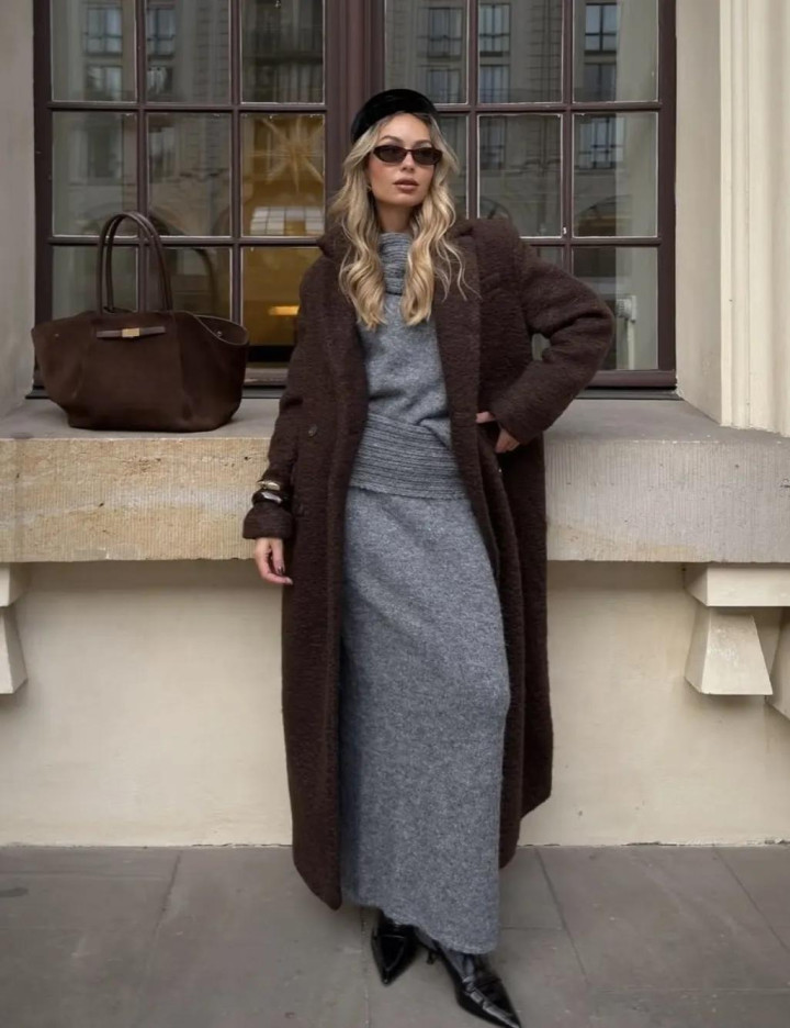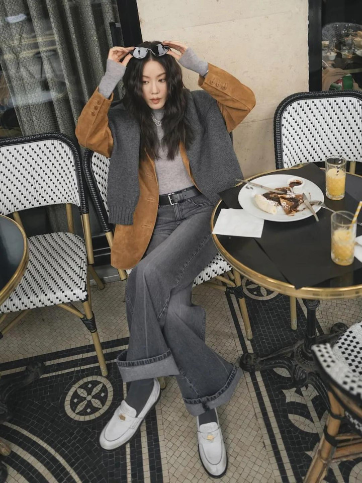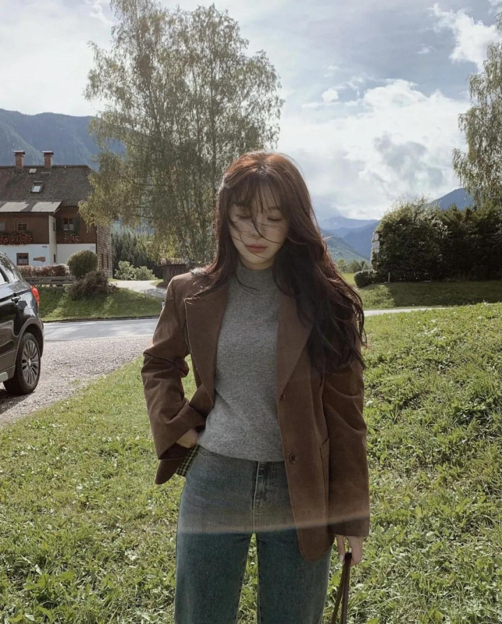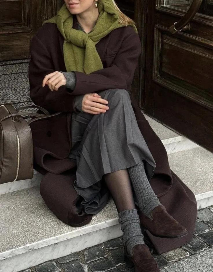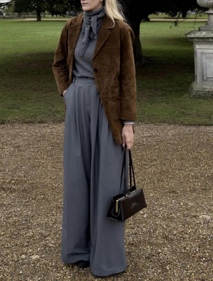 麂皮外衣本年又翻红了,尤其是棕调的。内搭灰色高领毛衣,下穿西裤,袜子与帽子呼应,连指尖的包袋齐不曾自便。