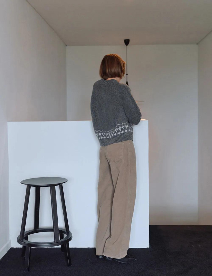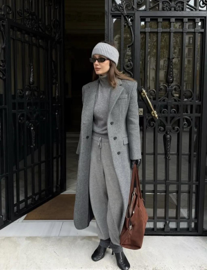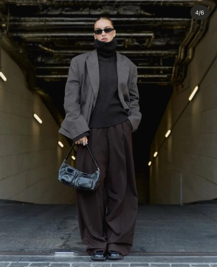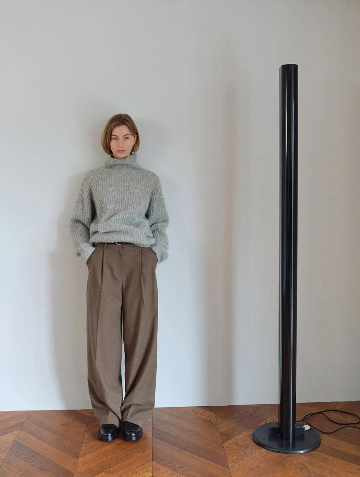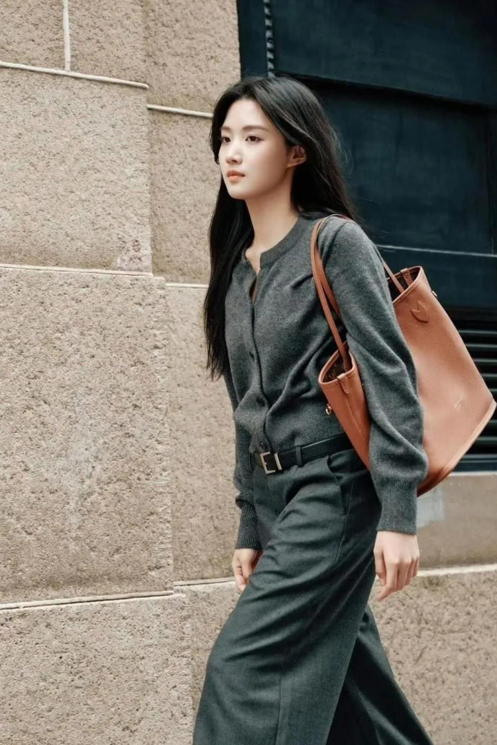 一件灰色羊绒衫,配一条阔腿裤,本是冷调到底。