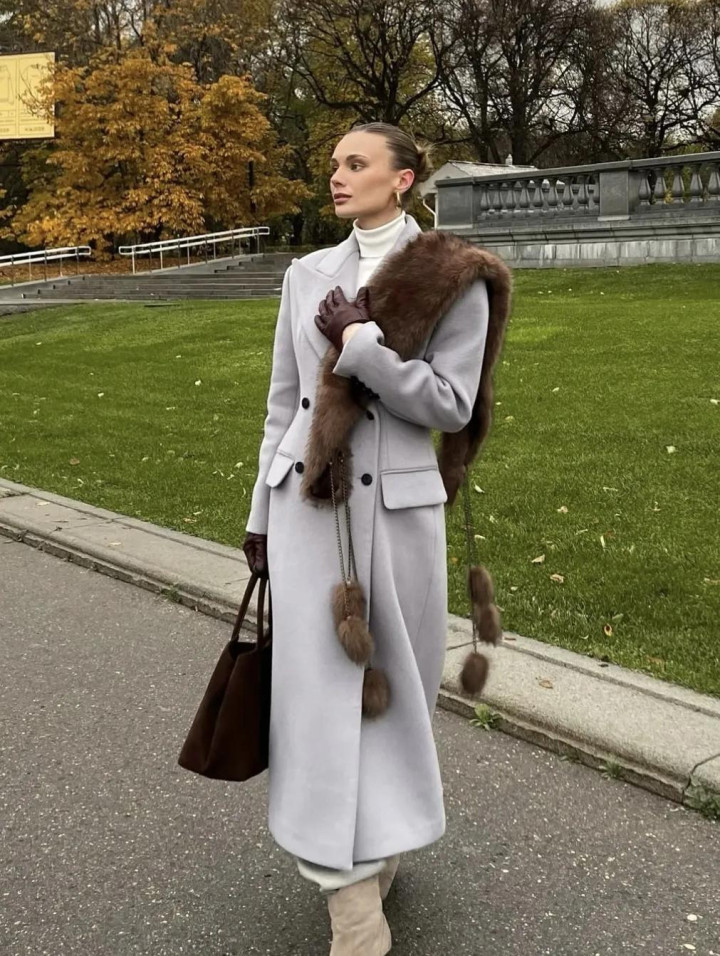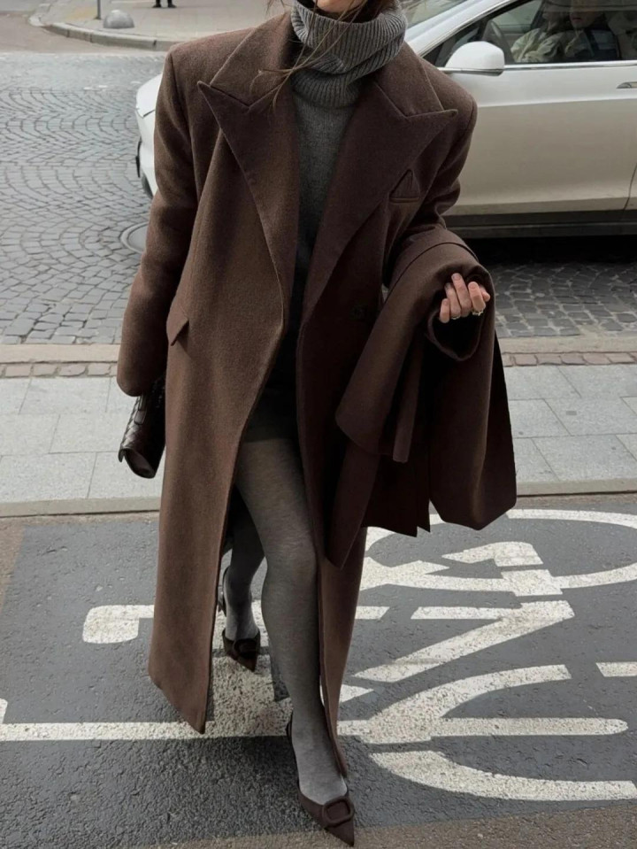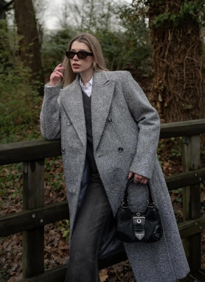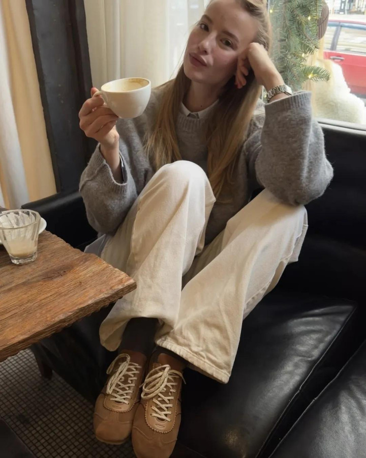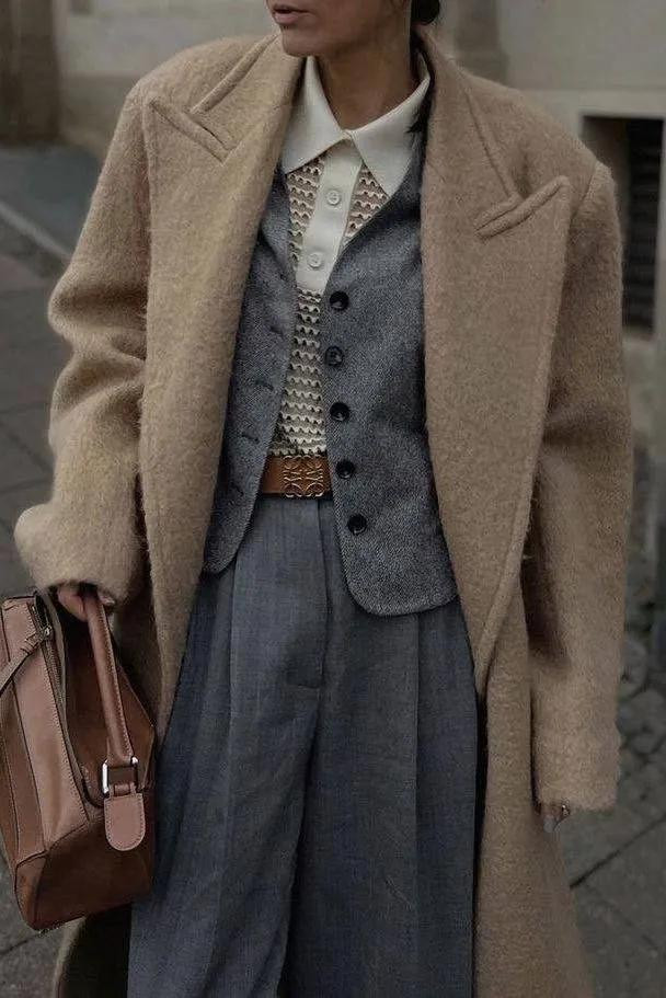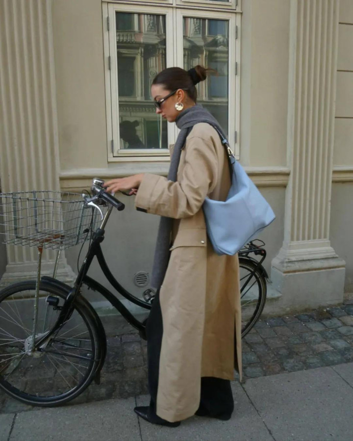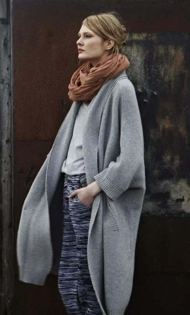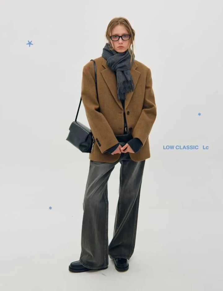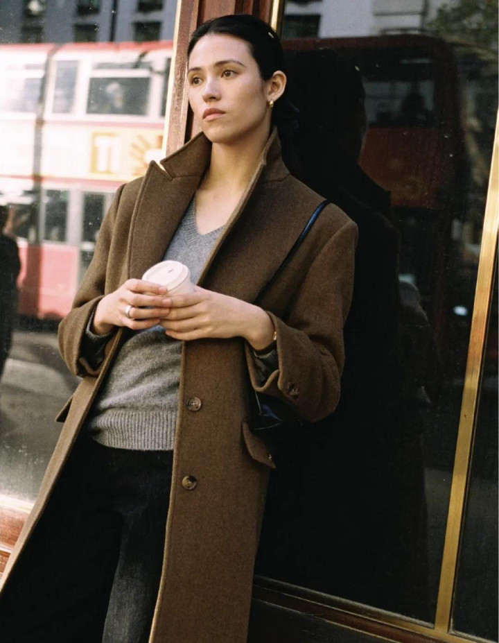 大衣亦如斯,一件棕咖色长呢大衣,配蓝灰牛仔裤,肩头松松搭件灰毛衣当披肩——少即是多,乱中有序。