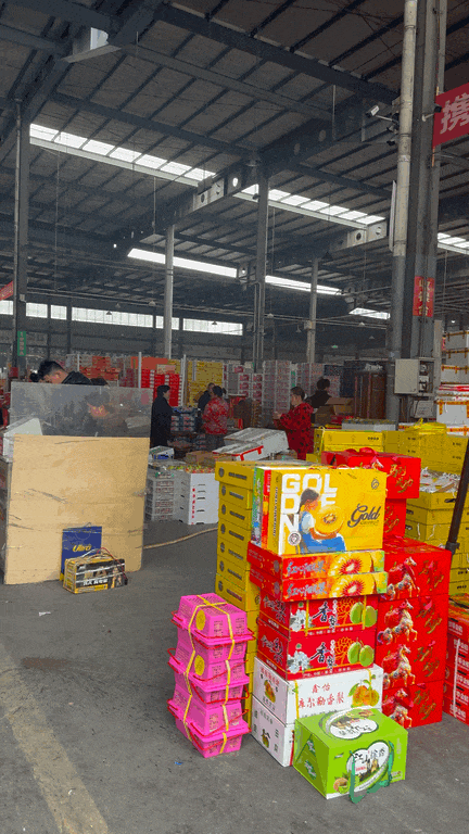 装满各种水果的小货车,穿梭在市场的内部道路里,各个店铺的老板也忙着准备年前的大量订单。