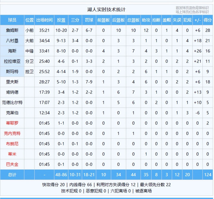 湖东谈主数据:詹姆斯28分10板12助、八村塁21分3板1助、里夫斯18分4板6助、海斯16分7板4助3断、拉拉维亚11分3板2助、肯纳德9分7板3助、斯玛特9分2板6助、范德比尔特5分6板2断、克莱伯5分1板、蒂耶罗2分。