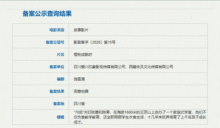 《樱桃熟练时》由闻明编剧饶雪漫操刀脚本,是本次备案中最具本质温度的作品之一。影片以南江县“70后”佳耦陈果、张蓉为原型,文牍他们在海拔1600米的云顶山创办家庭式学堂,十余年间服侍栽培上千名孩子的故事。记者了解到,影片原型东说念主物张蓉是当地留守儿童关爱处事的标杆,曾获“宇宙优秀童伴姆妈”荣誉,并当选四川省东说念主大代表。