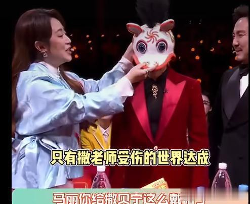 他们和撒贝宁的互动超搞笑,一运转极度把撒贝宁挤到后头去了,马丽给撒贝宁戴马头帽把他整张脸王人盖住。