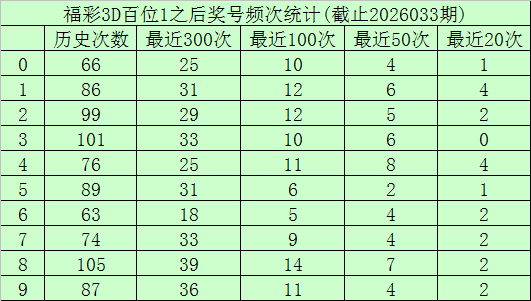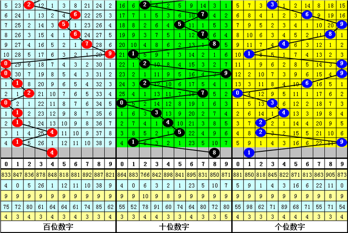 百位杀号:上期百位开出号码1,历史上百位号码1已开出847次了,最近100次百位号码1出现之后,其下期各号码频次鉴别为:号码8出现14次,1、2出现12次,4、9出现11次,0、3出现10次,7出现9次,5出现6次,6出现5次。