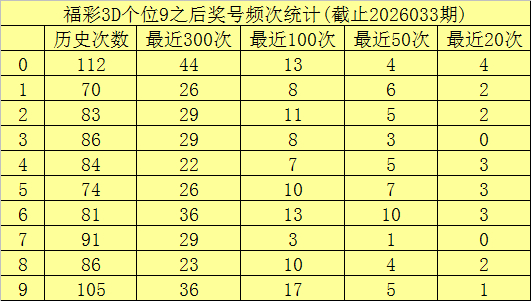 个位杀号:上期个位奖号为9,历史上个位奖号9共开出873次,最近100次个位奖号9出刻下,其下期号码0-9开出次数鉴别为:奖号9开出17次,0、6开出13次,2开出11次,5、8开出10次,1、3开出8次,4开出7次,7开出3次。