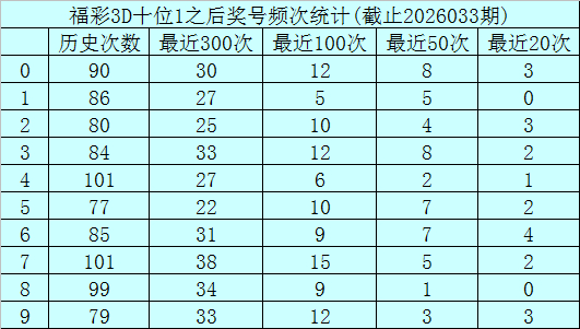 十位杀号:上期十位奖号为1,历史上十位奖号1共出现883期,前100次十位开出奖号1时,其下期0-9奖号频次鉴别为:奖号7开出15次,0、3、9开出12次,2、5开出10次,6、8开出9次,4开出6次,1开出5次。