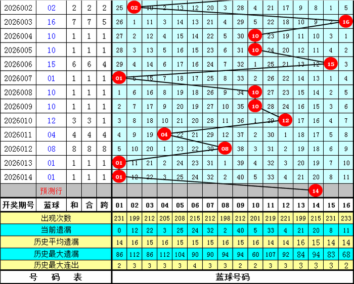 蓝球号码分析:上期蓝球为01,开出1路号码,蓝球最近10期012路比为2:7:1,最近30期012路比为8:14:8,最近100期012路比为28:40:32,本期蓝球看好2路号码,四码蓝球参考02、08、11、14。