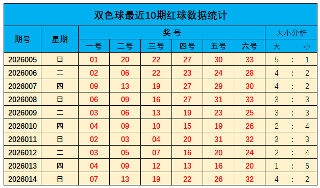 上期红球大小比为4:2,近10期大小比为31:29;总体上大奖号走势稍热,本期见原大数较上期走势降温,推选大小比为:2:4
