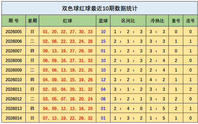 上期总结:双色球第2026014期开出奖号:红球07、13、19、22、26、32;蓝球01,其中红球三区比为1:3:2,开出1枚重号13,开出0组连号,蓝球开出一区号码01。