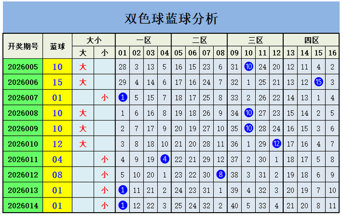 最近10期蓝球开出号码,四区比为:4:1:4:1,上期开出一区号,本期平和三区出号。推选号码:12