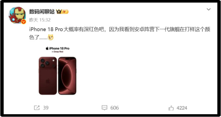 更有道理的是,博主还补充了一句:安卓阵营不仅在颜料上跟风,测度连外不雅也会效法iPhone 18 Pro Max。