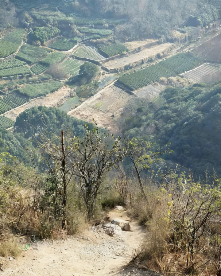 村中有一条小桥右转是泊车场,左转即是赶赴徒步的开始。沿着水泥路 一直上前,进程一派茶园,差未几走1公里这个形势,再右转即是咱们登顶水牛背的阶梯了。