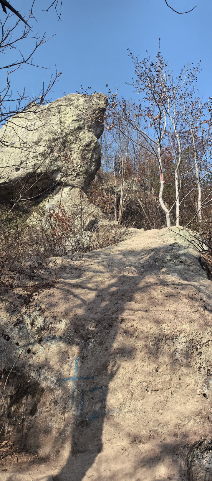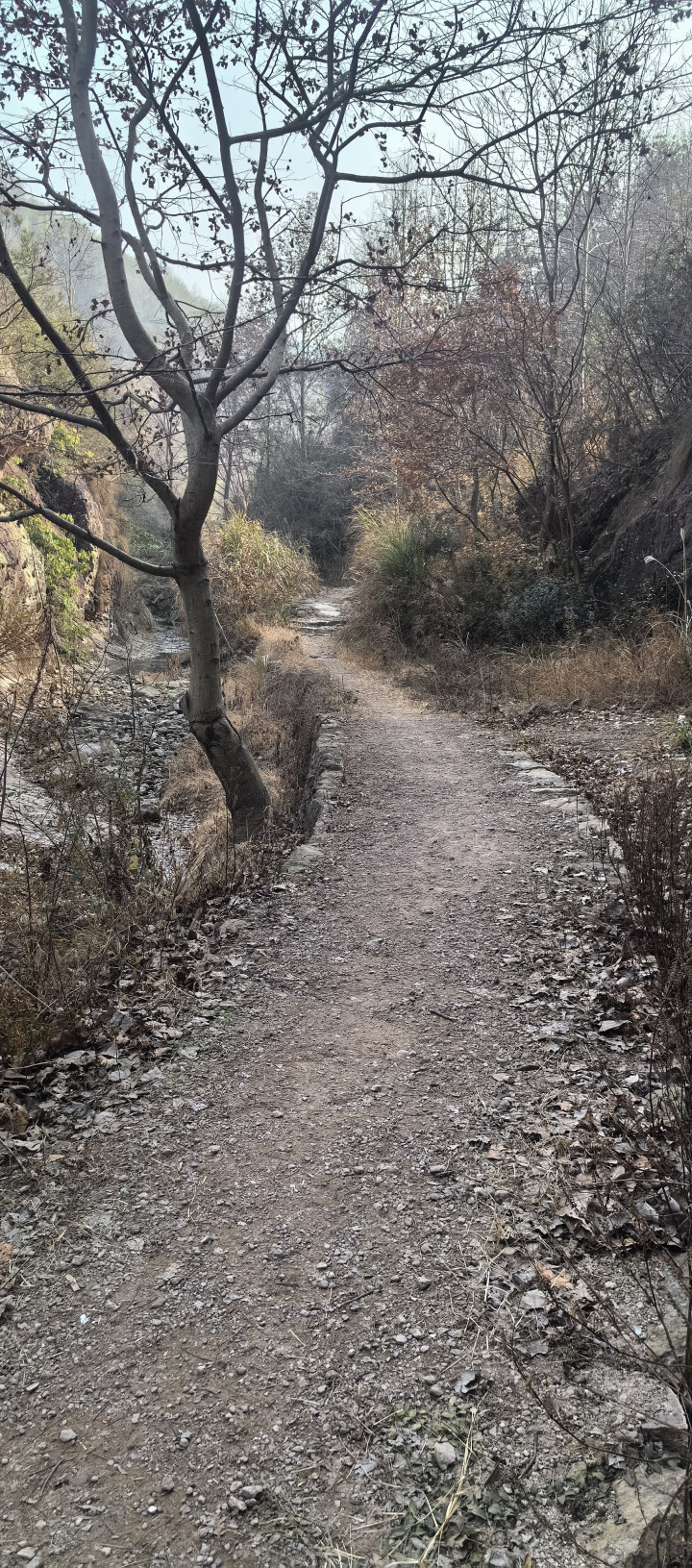 在进程很长一段的土路。在上坡与下坡中小走俄顷。就到了一处三岔口。从左边走,沿着山体旯旮走,相通不错到达赶赴石狗窦的阶梯。