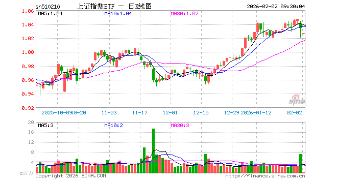 2月2日,上证指数ETF(510210)开盘跌0.77%,报1.026元。上证指数ETF(510210)重仓股方面,农业银行开盘涨0.15%,中国石油跌2.90%,贵州茅台涨1.71%,工业富联跌1.56%,中国银行涨0.00%,紫金矿业跌8.15%,中国神华跌0.67%,中国东谈主寿跌1.53%,招商银行涨0.54%,中国祯祥跌0.60%。