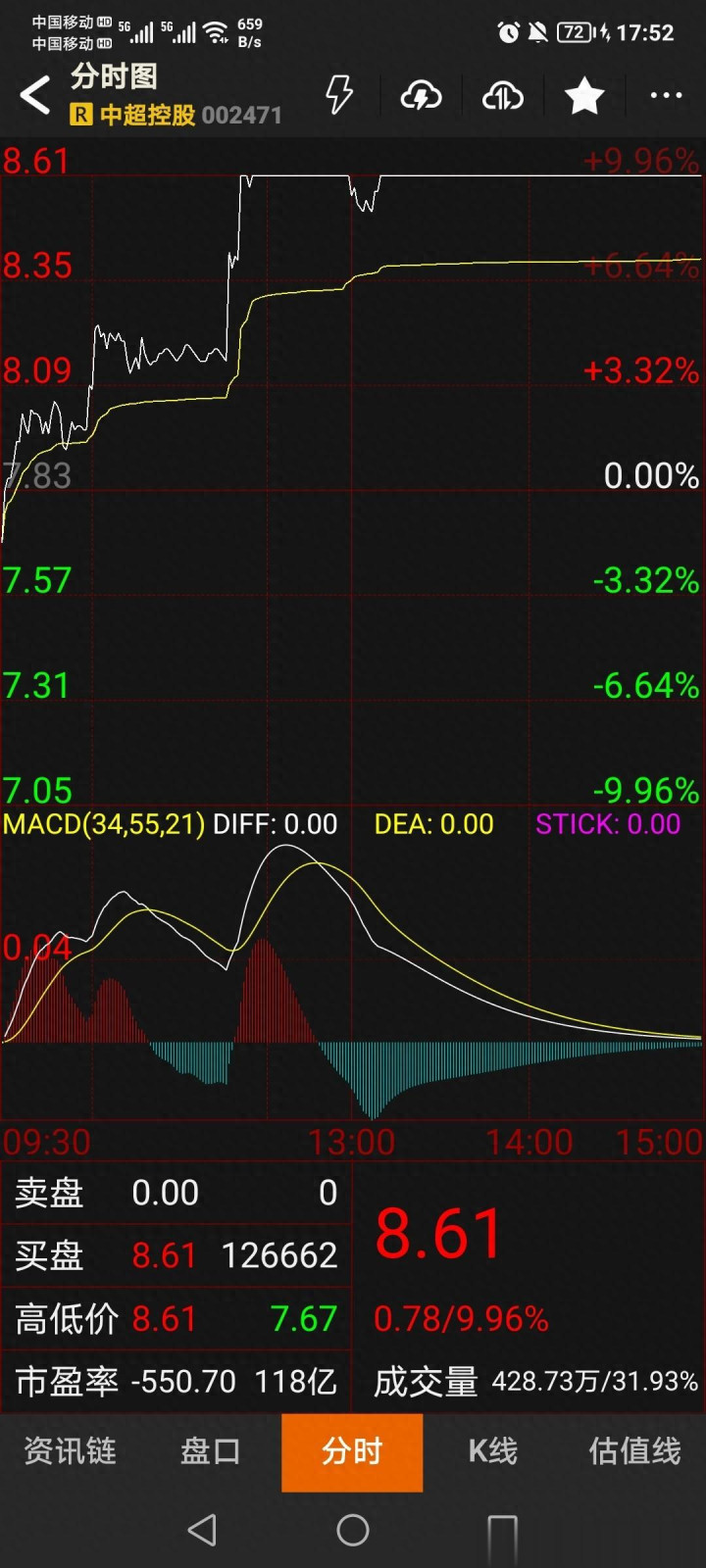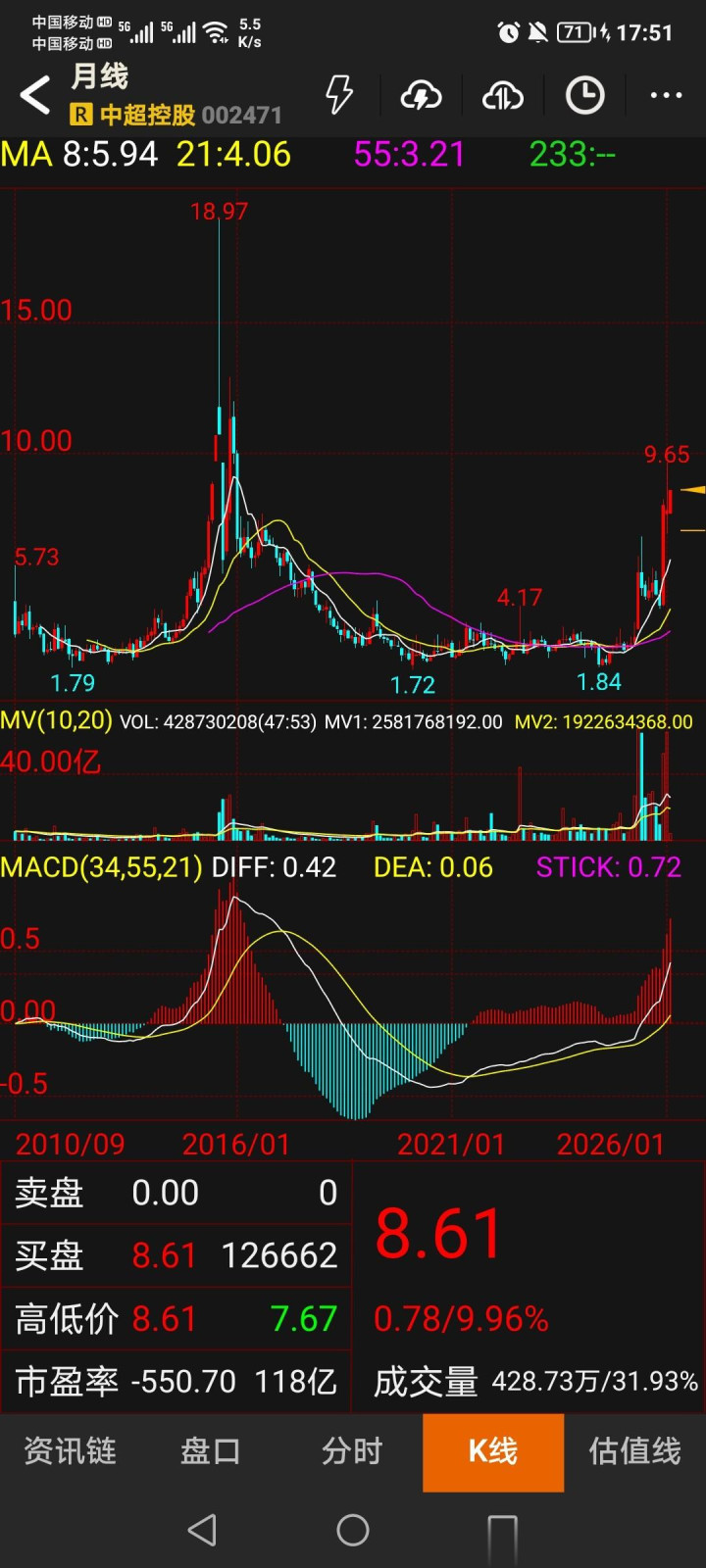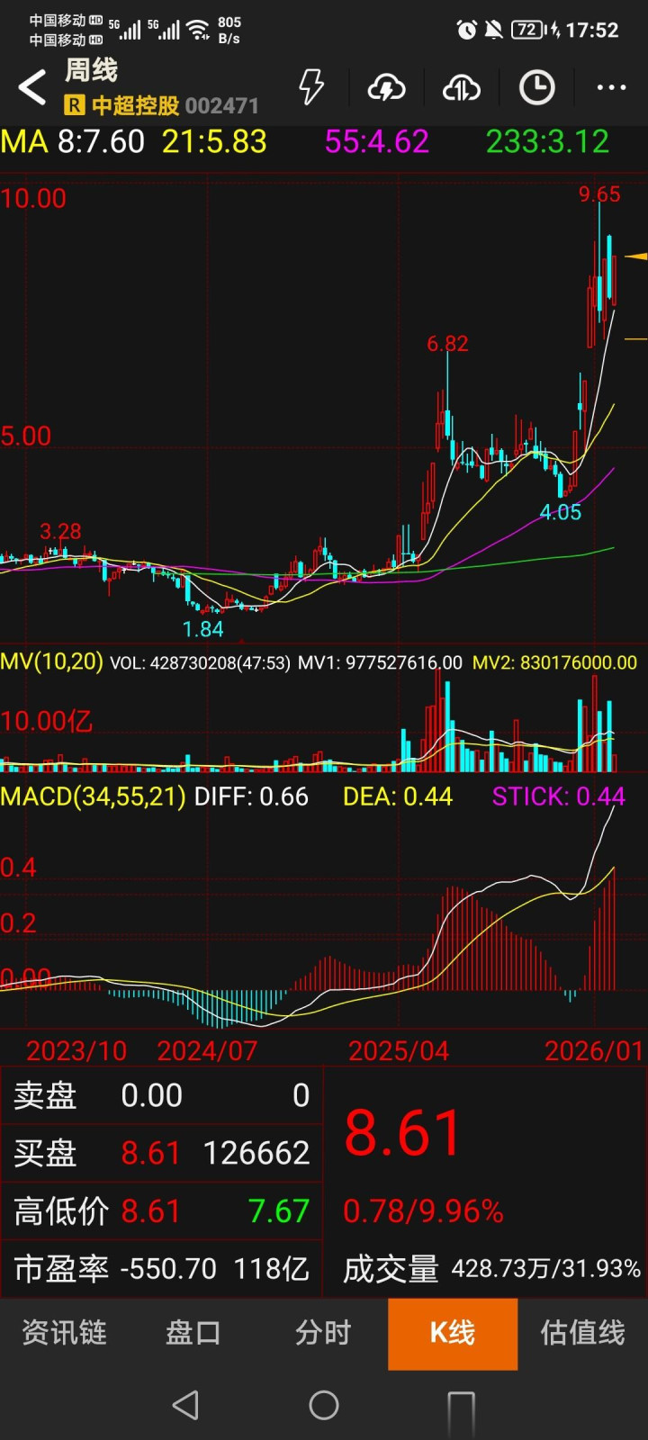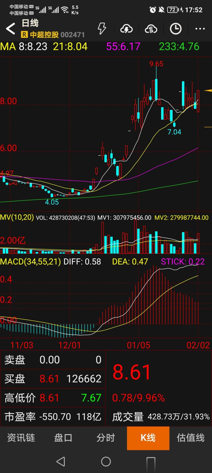 - 股价进展:2026年2月2日,中超控股股价涨停(9.96%),报收8.61元,成交额42873.0万股,创近期新高。