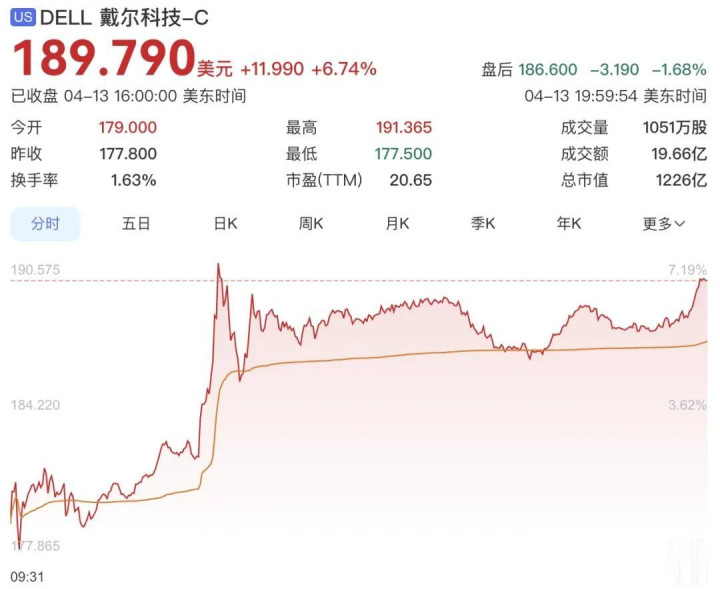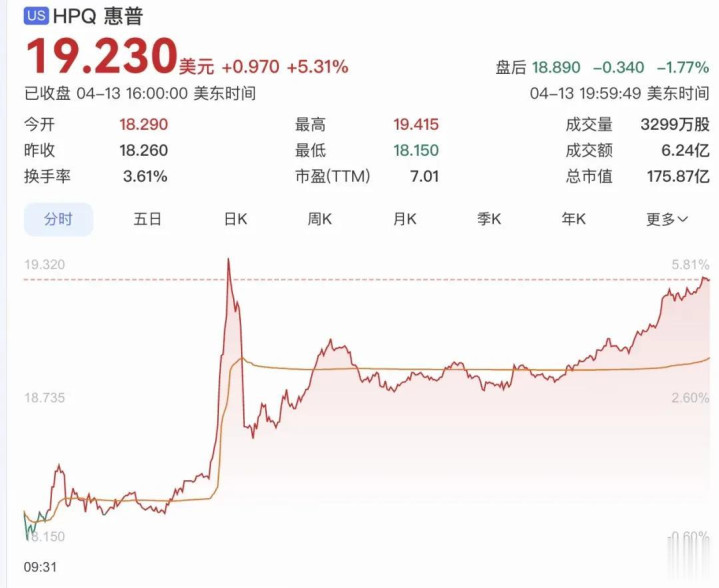 受此音讯影响,周一好意思股PC 板块大涨,戴尔科技涨 6.74%,惠普跟涨 5.31%。