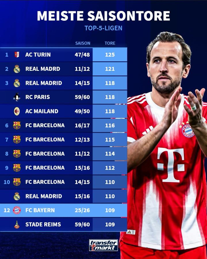 比赛下注app 五大联赛史上球队单季联赛进球榜: 拜仁109球暂排比肩第12位